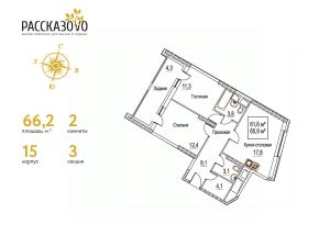 Продается 2-комнатная квартира в ЖК Рассказово на 10 этаже. Общая площадь квартиры составляет 66,3 кв.м. Квартира без отделки.