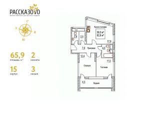 Продается 2-комнатная квартира в ЖК Рассказово на 11 этаже. Общая площадь квартиры составляет 63,3 кв.м. Квартира без отделки.