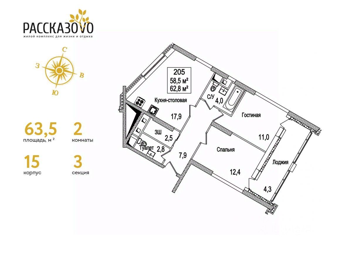 Продается 2-комнатная квартира в ЖК Рассказово на 15 этаже. Общая площадь квартиры составляет 63,5 кв.м. Квартира без отделки.