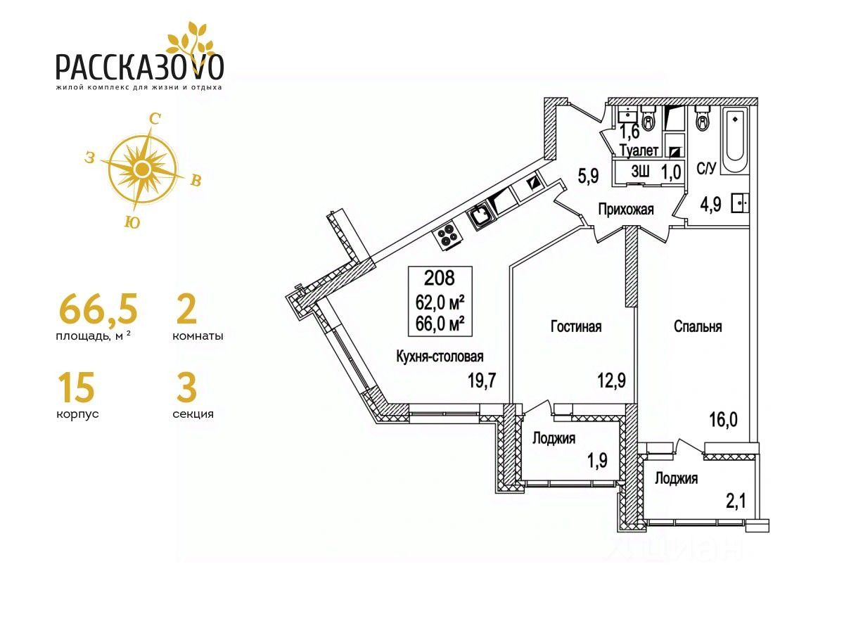 Продается 2-комнатная квартира в ЖК Рассказово на 15 этаже. Общая площадь квартиры составляет 66,5 кв.м. Квартира без отделки.