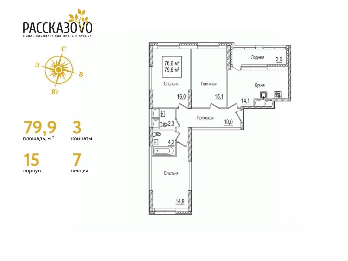 Продается 3-комнатная квартира в ЖК Рассказово на 19 этаже. Общая площадь квартиры составляет 79,9 кв.м. Квартира без отделки.