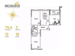Продается 3-комнатная квартира в ЖК Рассказово на 15 этаже. Общая площадь квартиры составляет 74,4 кв.м. Квартира без отделки.