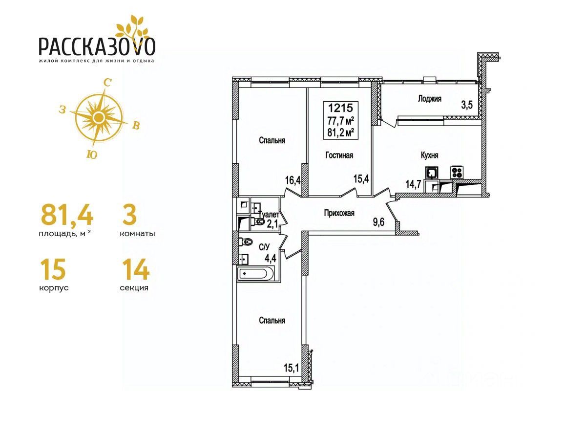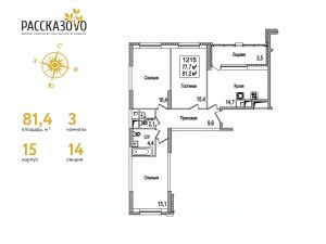 Продается 3-комнатная квартира в ЖК Рассказово на 14 этаже. Общая площадь квартиры составляет 81,4 кв.м. Квартира без отделки.