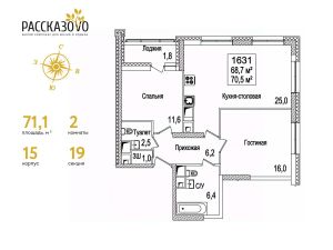 Продается 2-комнатная квартира в ЖК Рассказово на 10 этаже. Общая площадь квартиры составляет 71,1 кв.м. Квартира без отделки.