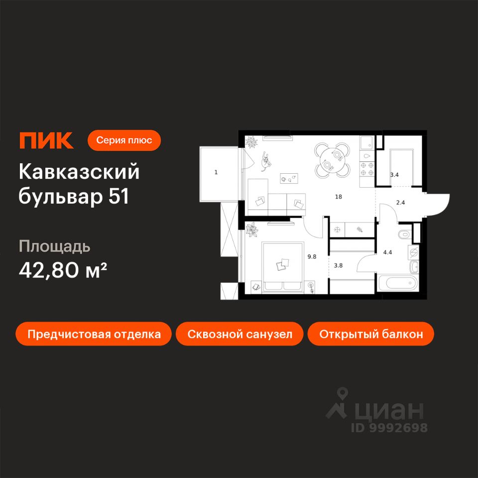 Продаётся 1-комн. квартира площадью 42,8 кв.м на 7 этаже 24 этажного дома (Корпус 3.5, Секция 2) проекта ПИК Кавказский бульвар 51. Светлый просторный подъезд на уровне земли, функциональная планировка, большие окна, предчистовая отделка.