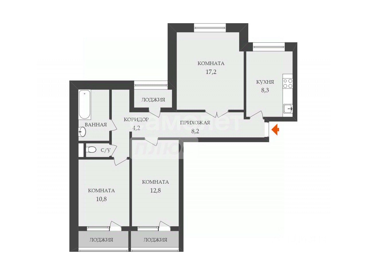 Три раздельные комнаты предлагают уединение и функциональность, а отдельный санузел добавляет удобства.