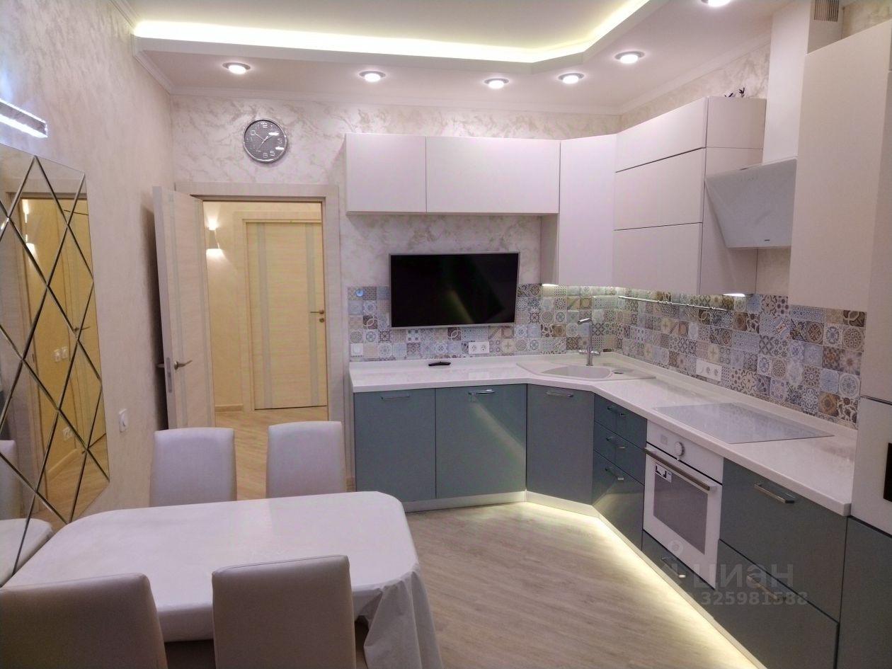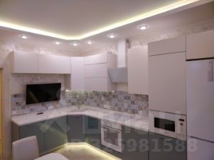 Встроенная кухонная мебель, сделанная на заказ и бытовая техника (холодильник, микроволновая плита, духовой шкаф, индукционная варочная панель, посудомоечная машина, вытяжка). Столешница выполнена из искусственного камня.