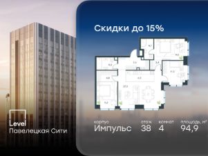 В Даниловском районе столицы (ЮАО) продаётся 4-комнатная квартира площадью 94.90 кв.м без отделки. Квартира расположена на 38 этаже 45-этажного корпуса 'Горизонт' в жилом комплексе бизнес-класса Level Павелецкая Сити. Высота потолков 3.00м.