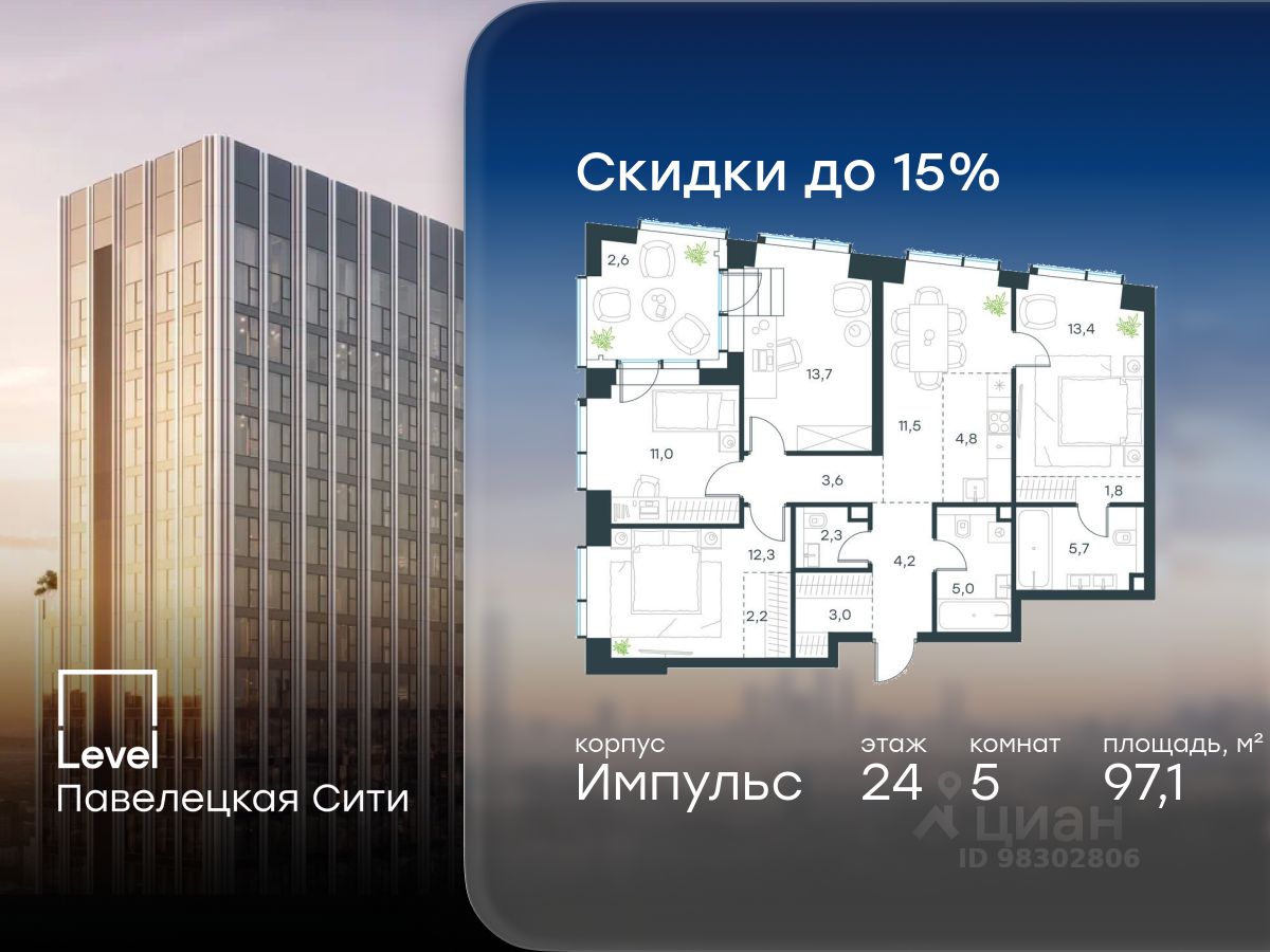 В Даниловском районе столицы (ЮАО) продаётся многокомнатная квартира площадью 97.10 кв.м без отделки. Квартира расположена на 24 этаже 45-этажного корпуса 'Горизонт' в жилом комплексе бизнес-класса Level Павелецкая Сити. Высота потолков 3.00м.