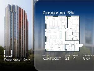 В Даниловском районе столицы (ЮАО) продаётся 4-комнатная квартира площадью 87.70 кв.м без отделки. Квартира расположена на 21 этаже 27-этажного корпуса 'Горизонт' в жилом комплексе бизнес-класса Level Павелецкая Сити. Высота потолков 3.00м.