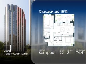 В Даниловском районе столицы (ЮАО) продаётся 3-комнатная квартира площадью 74.40 кв.м без отделки. Квартира расположена на 22 этаже 27-этажного корпуса 'Горизонт' в жилом комплексе бизнес-класса Level Павелецкая Сити. Высота потолков 3.00м.