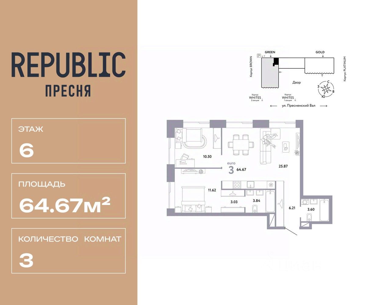 Продается 3комнатная квартира на 6 этаже от застройщика Страна Девелопмент. Площадь квартиры 64,67 кв. м.