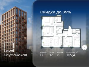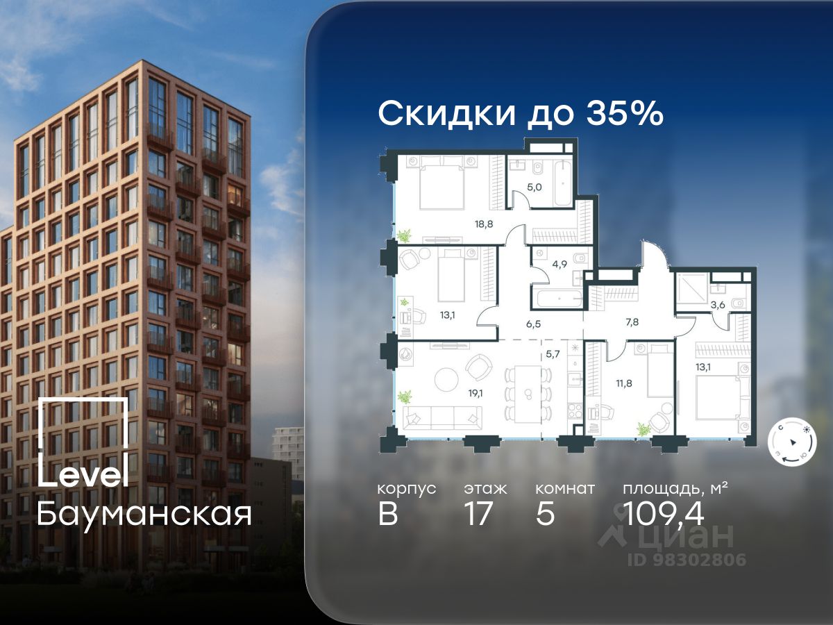 В Басманном районе (ЦАО) продается 5-комнатная квартира площадью 109.40 кв.м без отделки. Квартира расположена на 17 этаже 17-этажного корпуса " B" в жилом комплексе бизнес-класса Level Бауманская (компания Level Group).