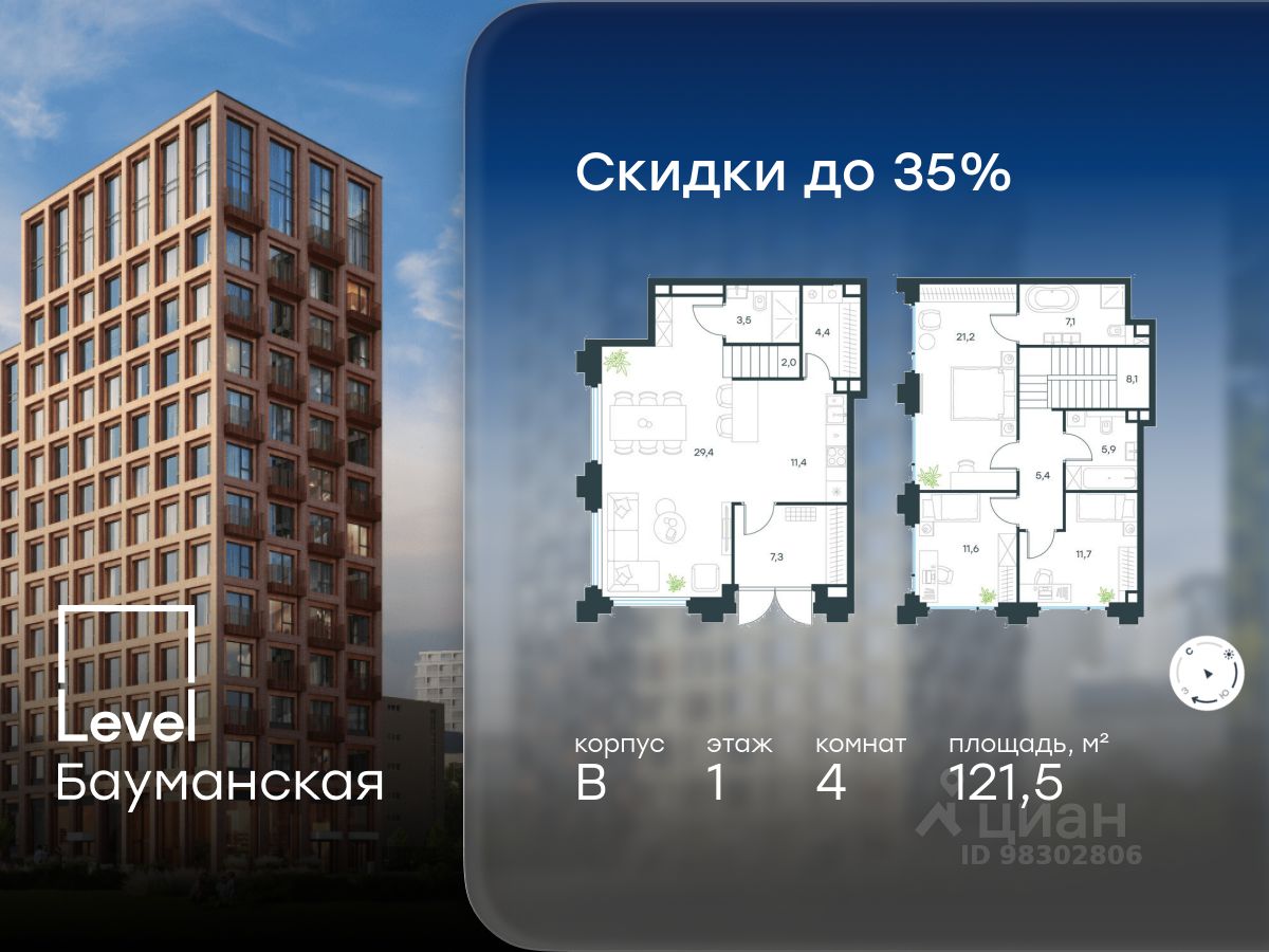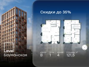 В Басманном районе (ЦАО) продается 4-комнатная квартира площадью 121.50 кв.м без отделки. Квартира расположена на 1 этаже 17-этажного корпуса " B" в жилом комплексе бизнес-класса Level Бауманская (компания Level Group).