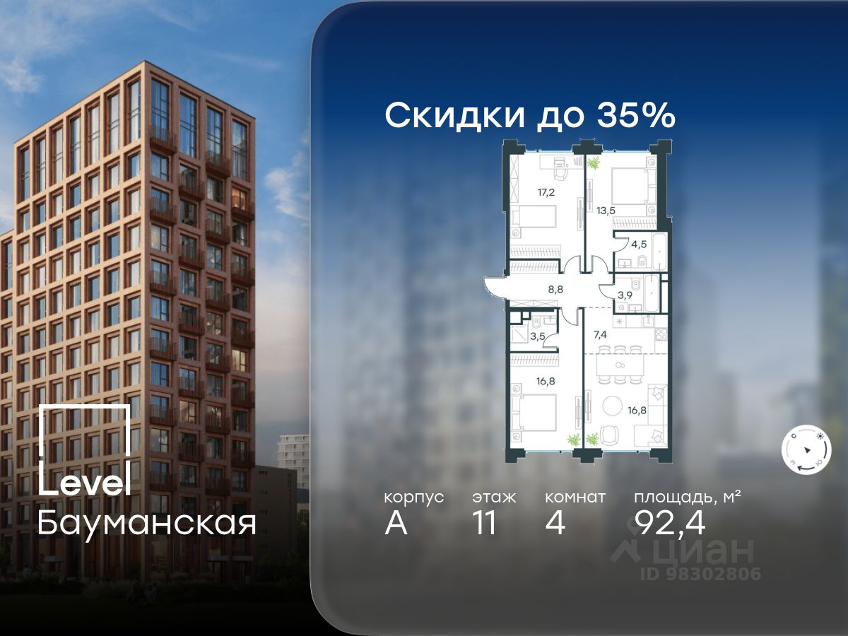 В Басманном районе (ЦАО) продается 4-комнатная квартира площадью 92.40 кв.м без отделки. Квартира расположена на 11 этаже 11-этажного корпуса " A" в жилом комплексе бизнес-класса Level Бауманская (компания Level Group).