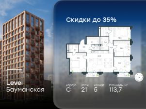 В Басманном районе (ЦАО) продается 5-комнатная квартира площадью 113.70 кв.м без отделки. Квартира расположена на 21 этаже 21-этажного корпуса " C" в жилом комплексе бизнес-класса Level Бауманская (компания Level Group).
