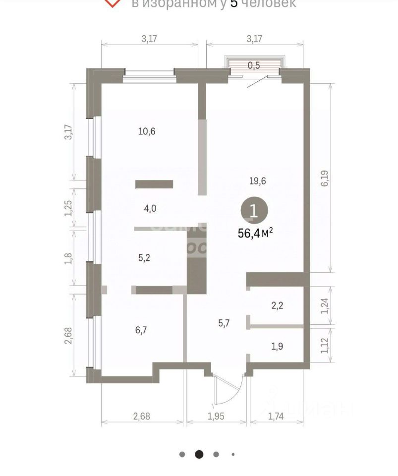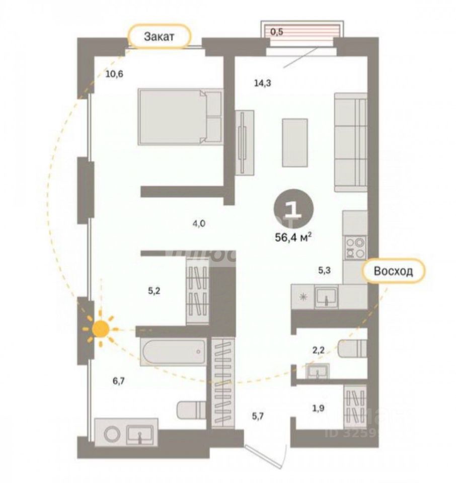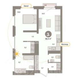 Арт. 115641133 Уникальная однокомнатная квартира евро-формата площадью 56.4 м² с просторной кухней-гостиной и остеклением на две стороны.