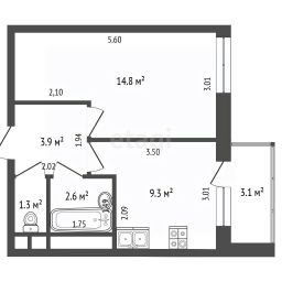 - Общая 31,9 м2 / кухня 9,3 м2 / комната 14,8 м2