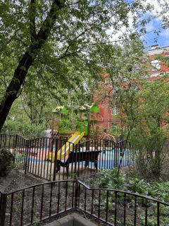 Большой внутренний двор утопает в зелени. Детская площадка. Много парковочных мест вокруг дома.