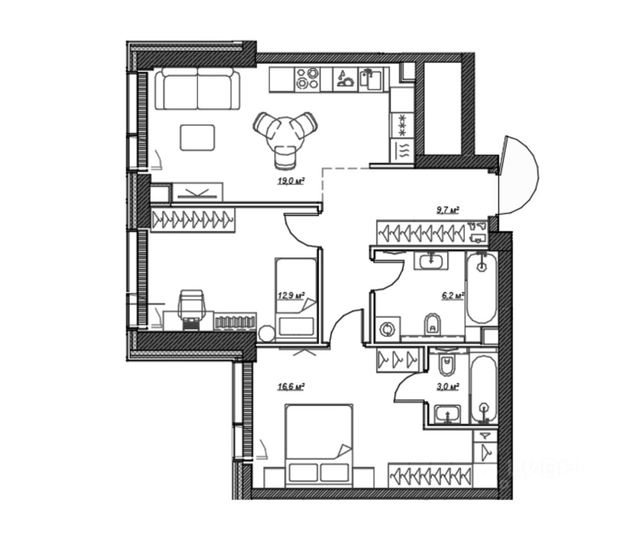 Комнаты - 16.6-14-12,9 м²