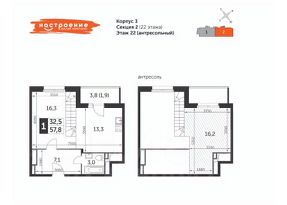Продаётся 2-комнатная двухуровневая квартира в сданном доме общей площадью 57,8 кв.м., на 22 этаже.