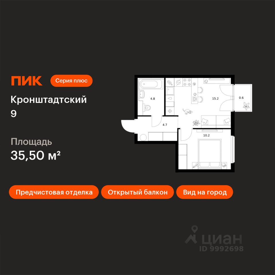 Продаётся 1-комн. квартира площадью 35,5 кв.м на 10 этаже 12 этажного дома (Корпус 1.1.1, Секция 1) проекта ПИК Кронштадтский 9. Светлый просторный подъезд на уровне земли, функциональная планировка, большие окна, предчистовая отделка.