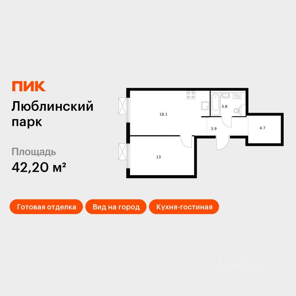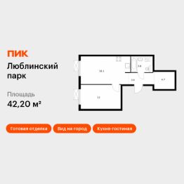 Продаётся 1-комн. квартира площадью 42,2 кв.м на 6 этаже 17 этажного дома (Корпус 14.6, Секция 4) проекта ПИК Люблинский парк. Светлый просторный подъезд на уровне земли, функциональная планировка, большие окна, c отделкой.