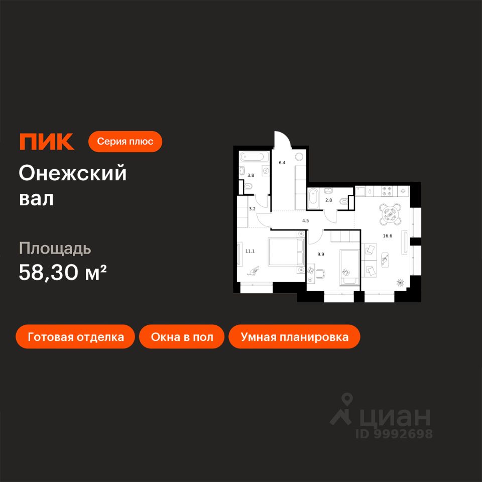 Новостройка! Продается 2-комн. кв-ра площадью 58,3 кв.м, (Корпус 1.1.1, Секция 1) 18 этаж 23-этажного дома в Онежский вал от ПИК. Квартал "Серии плюс" строится на севере Москвы, в 10 минутах пешком от станции метро "Селигерская" и МЦД "Моссельмаш". Проект понравится всем, кто привык к комфортной жизни и ценит возможность оставаться в ритме большого города и быстро добираться до центра столицы.