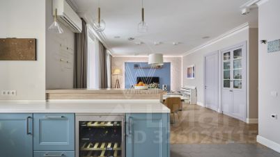 Установлена система теплый пол, межкомнатные двери с полотном высотой 2,3 метра. Кухня оборудована мебелью немецкого производителя и бытовой техникой премиальных брендов: посудомоечная машина Miele; варочная панель, духовой шкаф и микроволновая печь Gaggenau; холодильник, морозилка, винный шкаф Liebherr. Светильники из Италии.