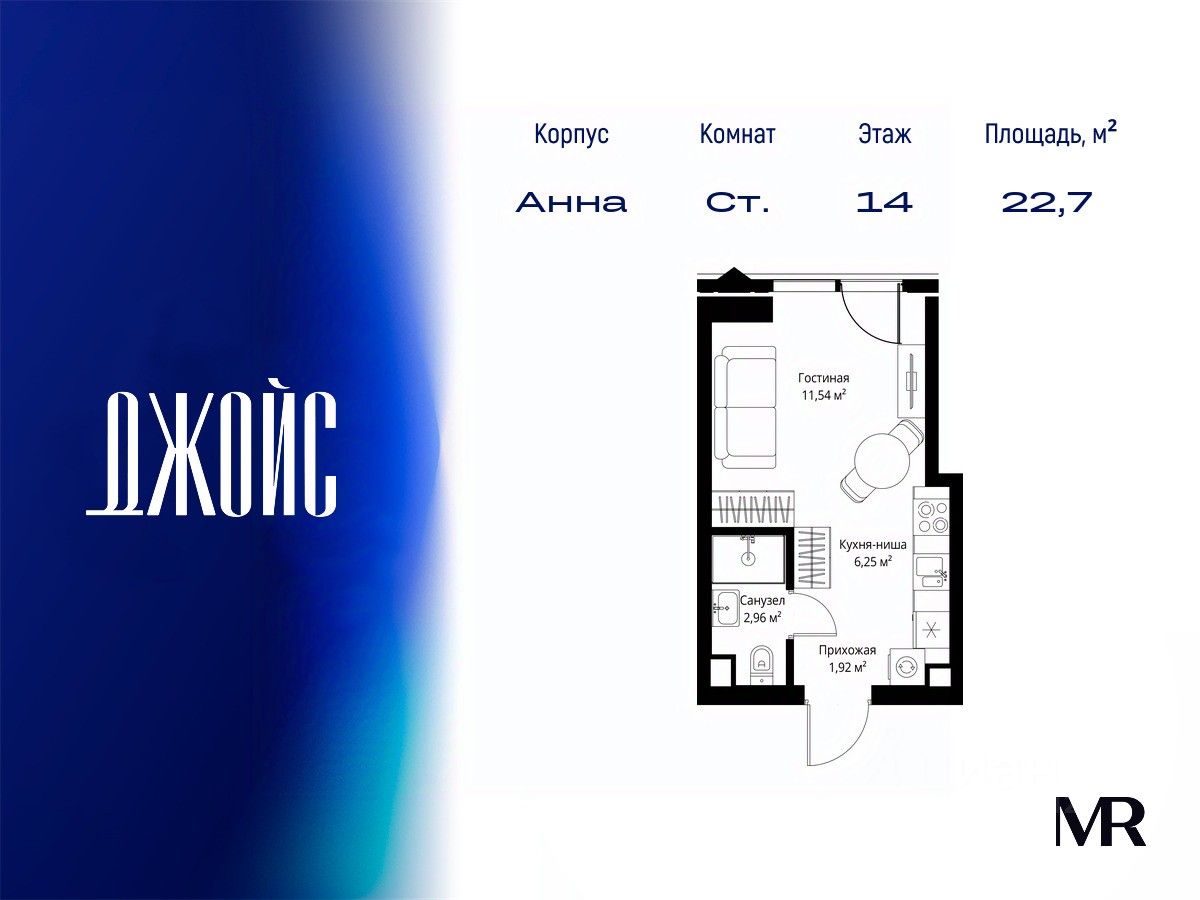 В продаже квартира площадью 22.67 м² с предчистовой отделкой на 14 этаже 55 этажного дома. Квартира расположена в корпусе Анна.