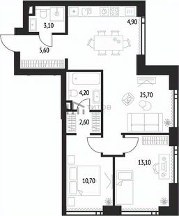 Евро-23 кухня-гостиная + 2 спальни