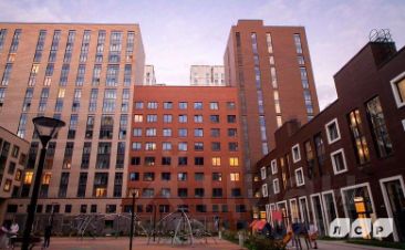 Придомовая территория благоустроена парками c ландшафтным дизайном и водоемами по проекту архитектора Джерри Ван Эйка. Во дворах находятся детские и спортивные площадки, велосипедные и пешеходные дорожки, малые архитектурные формы, а также набережная со спусками к Москве-реке.
