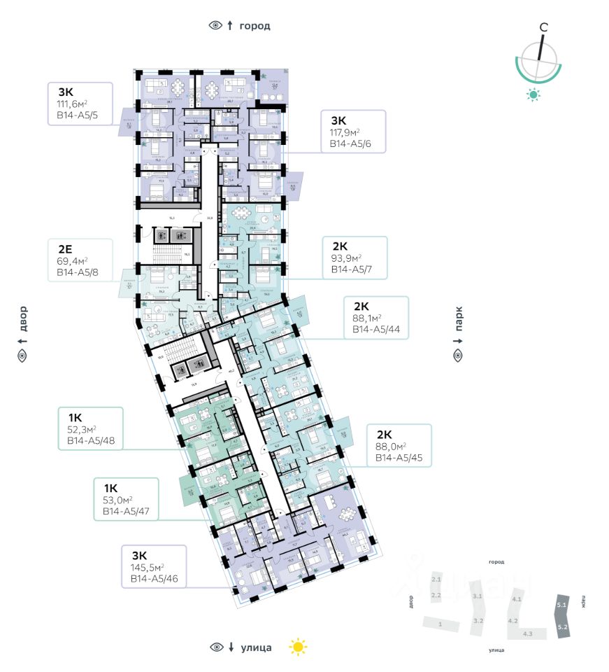 Архитектуру корпусов квартала разработало итальянское бюро. В облике отражена природная палитра: золотисто-бронзовый фасад корпуса Адвансд, выполненный из объёмных металлических элементов со сложным профилем, стал архитектурной доминантой квартала. Из окон открываются панорамные виды на реку и парк. Всего три минуты пешком — и вы на набережной. В14 примыкает к главному парку СберСити. В квартале — зелёные дворы без машин с крупномерными растениями, кустарниками, многолетними цветами, детскими площадками и тихими зонами отдыха.