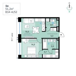 В продаже — однокомнатная квартира с чистовой отделкой, общей площадью 51,2 кв. м. Квартира расположена на четвертом этаже девятиэтажного корпуса Адвансд в квартале В14 нового района СберСити, который строит Сбер. Дом расположен на первой береговой линии Москвы-реки.