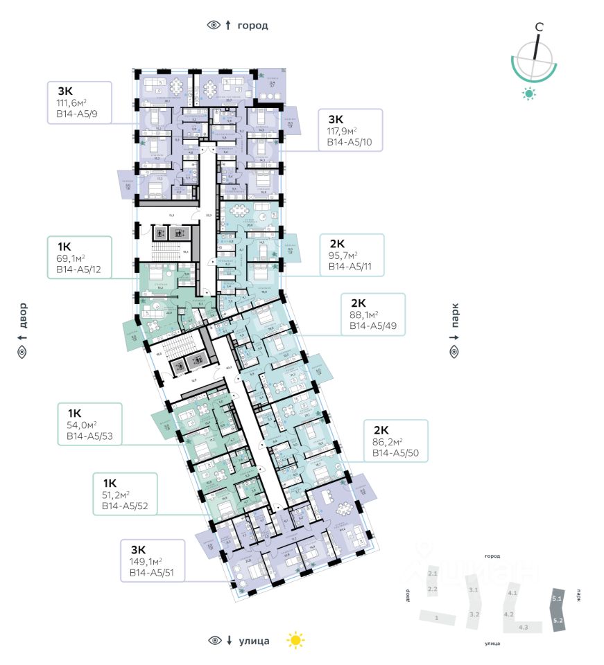 Архитектуру корпусов квартала разработало итальянское бюро. В облике отражена природная палитра: золотисто-бронзовый фасад корпуса Адвансд, выполненный из объёмных металлических элементов со сложным профилем, стал архитектурной доминантой квартала. Из окон открываются панорамные виды на реку и парк. Всего три минуты пешком — и вы на набережной. В14 примыкает к главному парку СберСити. В квартале — зелёные дворы без машин с крупномерными растениями, кустарниками, многолетними цветами, детскими площадками и тихими зонами отдыха.