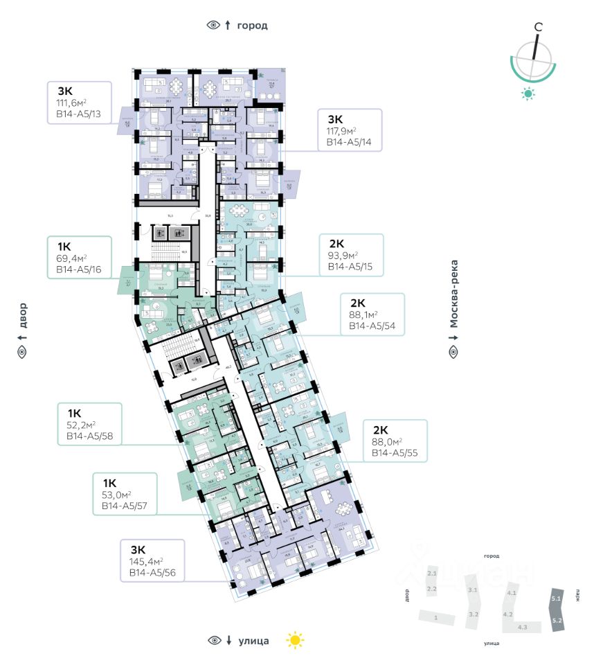 Архитектуру корпусов квартала разработало итальянское бюро. В облике отражена природная палитра: золотисто-бронзовый фасад корпуса Адвансд, выполненный из объёмных металлических элементов со сложным профилем, стал архитектурной доминантой квартала. Из окон открываются панорамные виды на реку и парк. Всего три минуты пешком — и вы на набережной. В14 примыкает к главному парку СберСити. В квартале — зелёные дворы без машин с крупномерными растениями, кустарниками, многолетними цветами, детскими площадками и тихими зонами отдыха.