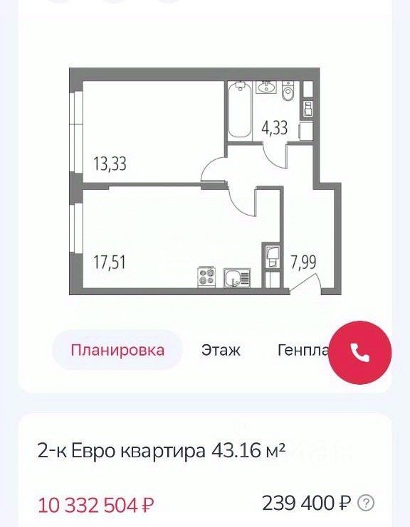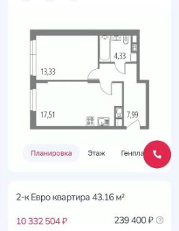 Квартира площадью 43,16 кв.м.