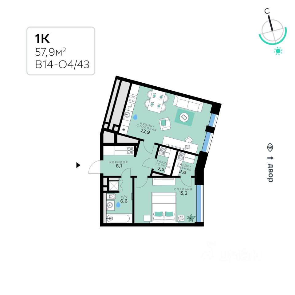 В продаже — однокомнатная квартира, общей площадью 57,9 кв. м. Квартира расположена на шестом этаже девятиэтажного корпуса Оптимум в квартале В14 нового района СберСити, который строит Сбер.