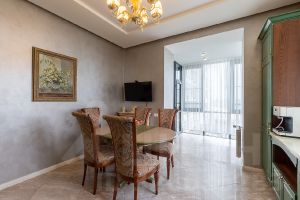 Квартира в идеальном состоянии. Общая площадь 111 м2. Выполнен качественный, дизайнерский ремонт в классическом стиле. В отделке использованы дорогие материалы. Удачная планировка трёх спален с большими окнами(площадь комнат 25,6м2; 20,9 м2 и 18.3м2). Высокие потолки 3 м., полы из пробки и керамогранита с электрическим подогревом, двери из массива ольхи, кондиционеры Mitsubishi в каждой комнате. 2 просторных санузла с ванной и душевой кабиной, итальянская плитка и сантехника. Полностью укомплектована мебелью из массива дерева под заказ.