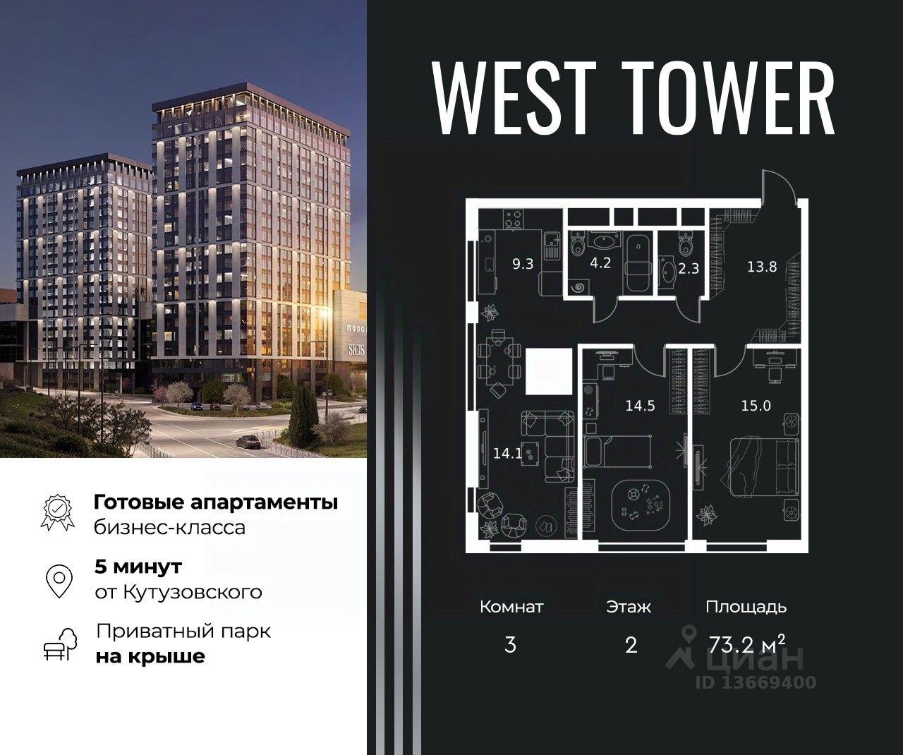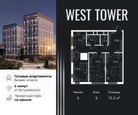 West Tower — апартаменты с премиальным сервисом на Аминьевском шоссе. Развитая инфраструктура и хорошая транспортная доступность. Рядом три станции метро: Аминьевская, Давыдково и Мичуринский проспект. У подножия коплекса находится Природный заказника Долина реки Сетунь, который дополнен собственным парком на крыше.