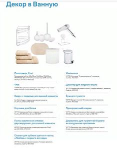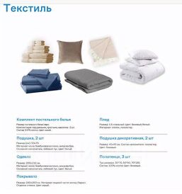 - Укомплектованная текстилем: комплект постельного белья, 2 подушки, плед, одеяло, покрывало, 2 декоративных подушки, 3 полотенца
