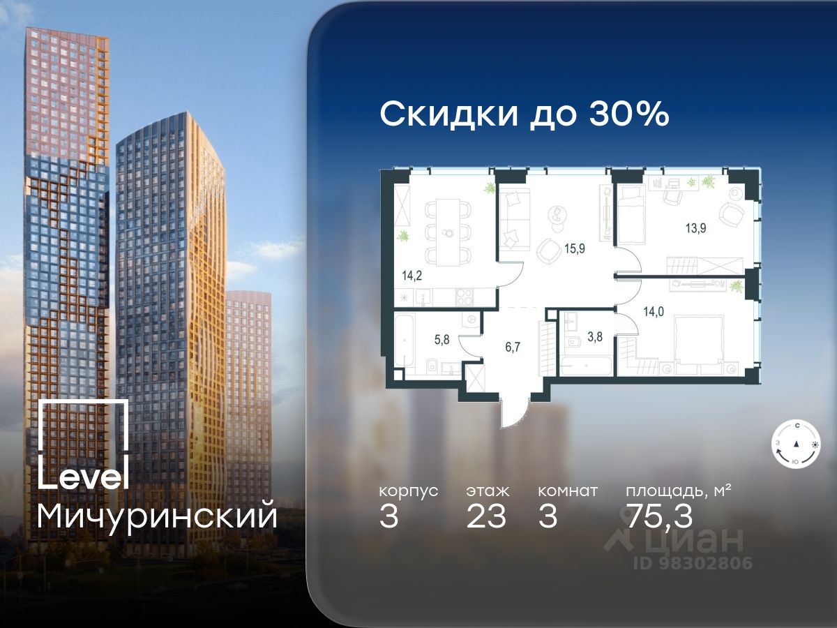 Цена указана с учётом скидки при 100%-й оплате, несубсидированной ипотеке, рассрочке (кроме программы "Рассрочка 0%"). В жилом квартале, расположенном на границе с природным заказником "Долина реки Очаковки", продаётся 3-комнатная квартира площадью 75.30 кв.м с отделкой white box. Квартира расположена на 23 этаже 30-этажного корпуса 3 в жилом комплексе бизнес-класса Level Мичуринский (компания Level Group/Левел групп). Отличная транспортная доступность: - от 10 мин. пешком до станции метро "Мичуринский проспект" - 15 мин. пешком до станции метро "Аминьевская" - 7 мин. на авто до МКАД - 10 мин. на авто до ТТК - 15 мин. на авто до Москва-Сити Продуманный архитектурный проект: - Выразительная архитектура от известных бюро: корпуса 1-6 - СПИЧ, корпуса 7-13 - Borisov Architects; - Из окон открываются живописные виды на парки, Москва-Сити и МГУ; - Высокие потолки до 6,35 м; - Стильные лобби с окнами в пол и высокими потолками до 4,7 м; - С каждого этажа дома на лифте можно спуститься в подземный отапливаемый паркинг. Расположение: Level Мичуринский строится в одном из самых зелёных районов Москвы - Очаково-Матвеевское. Этот уголок столицы идеален для поддержания здорового образа жизни. В шаговой доступности от проекта находятся заказник "Долина реки Очаковки" - 1 мин. пешком и Очаковский парк - 7 мин. пешком. На велосипеде можно добраться до таких парков, как "Событие", парк Олимпийской деревни, парк 50-летия Октября и парк Школьников. В 15 минутах езды на авто расположено более 30 детских садов (из них 14 в пешей доступности), 32 школы (из них 13 в пешей доступности) и 14 вузов. Также в ближайшем окружении - более 25 медицинских учреждений, 11 спортивных клубов и 22 продуктовых супермаркета. Внутренняя инфраструктура: На территории жилого комплекса строится три детских сада и школа. На первых этажах домов откроется супермаркет, фитнес-центр, ресторан, кафе и другие сервисы. Подземные этажи займут паркинги: трёхуровневые - в этапах 1 и 2, одноуровневый - в этапах 3 и 4. Преимущества проекта: - 4,5 га благоустроенной территории с видовым мостом, уличным кинотеатром, зонами для тихого отдыха, работы, воркаута, площадки для петанка, футбола, настольного тенниса и пляжного волейбола. - Дизайнерские лобби с панорамным видом на двор, мойками для лап животных и комфортными зонами ожидания. - Безопасность жителей: круглосуточное видеонаблюдение всех зон общего пользования (лобби, лифты, паркинги, детские площадки), система контроля доступа, управление видеодомофоном через мобильное приложение, единый ключ доступа на территорию жилого комплекса. - Технологии и комфорт: высокоскоростной Wi-Fi в лобби и на придомовой территории, автоматическая система контроля и учёта ресурсов, абонентская связь с консьержем, распознавание номеров автомобилей при въезде в паркинг и выезде из него.