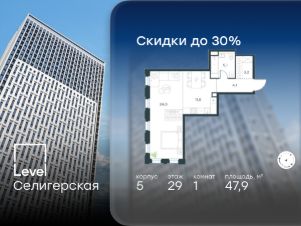 В жилом квартале, расположенном в южной части района Западное Дегунино, продаётся 1-комнатная квартира площадью 47.90 кв.м без отделки. Квартира расположена на 29 этаже 40-этажного корпуса 5 в жилом комплексе комфорт-класса Level Селигерская (компания Level Group/Левел групп).