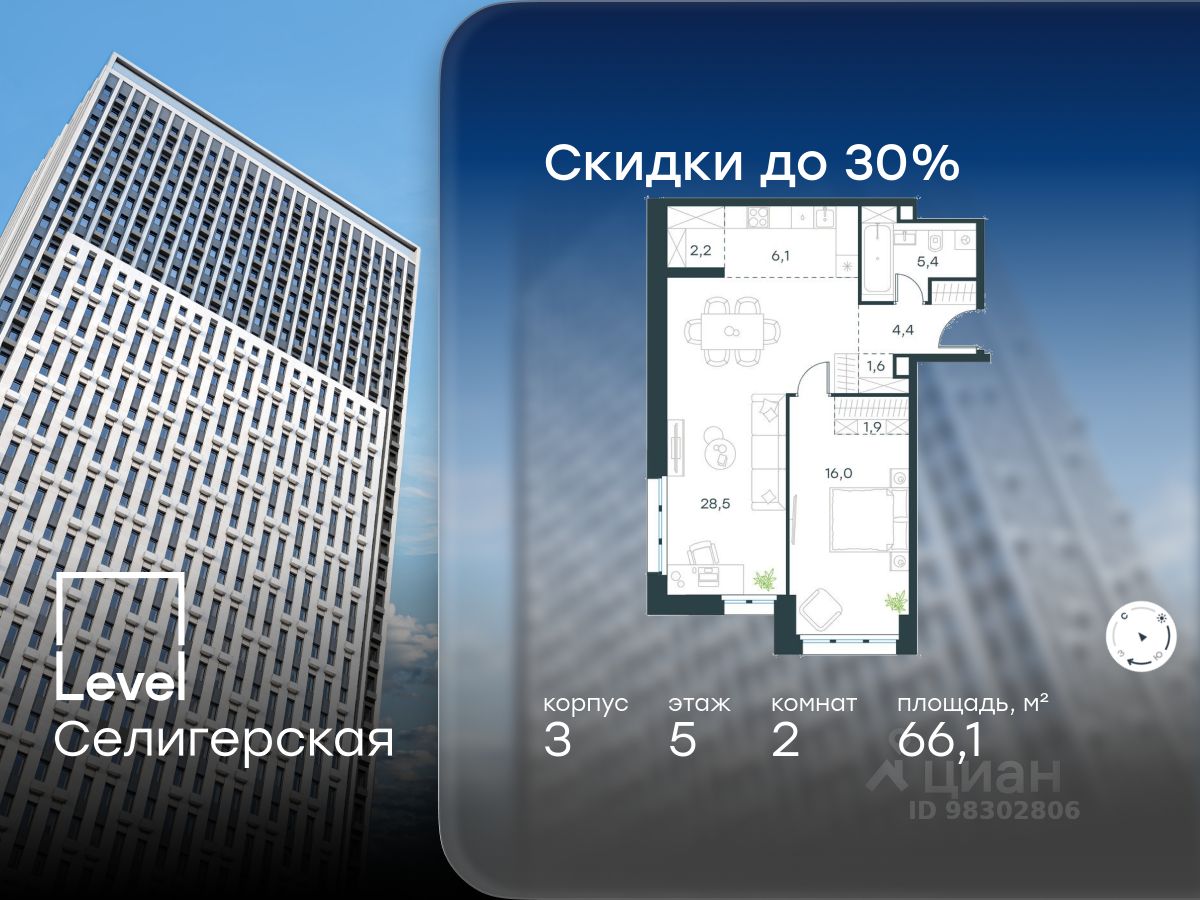В жилом квартале, расположенном в южной части района Западное Дегунино, продаётся 2-комнатная квартира площадью 66.10 кв.м без отделки. Квартира расположена на 5 этаже 40-этажного корпуса 3 в жилом комплексе комфорт-класса Level Селигерская (компания Level Group/Левел групп).