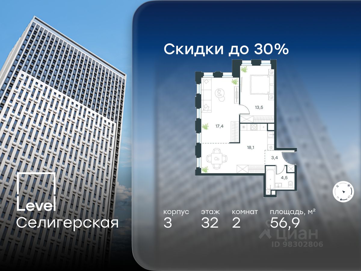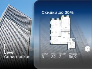 В жилом квартале, расположенном в южной части района Западное Дегунино, продаётся 2-комнатная квартира площадью 56.90 кв.м без отделки. Квартира расположена на 32 этаже 40-этажного корпуса 3 в жилом комплексе комфорт-класса Левел Селигерская (компания Левел Group/Левел групп).