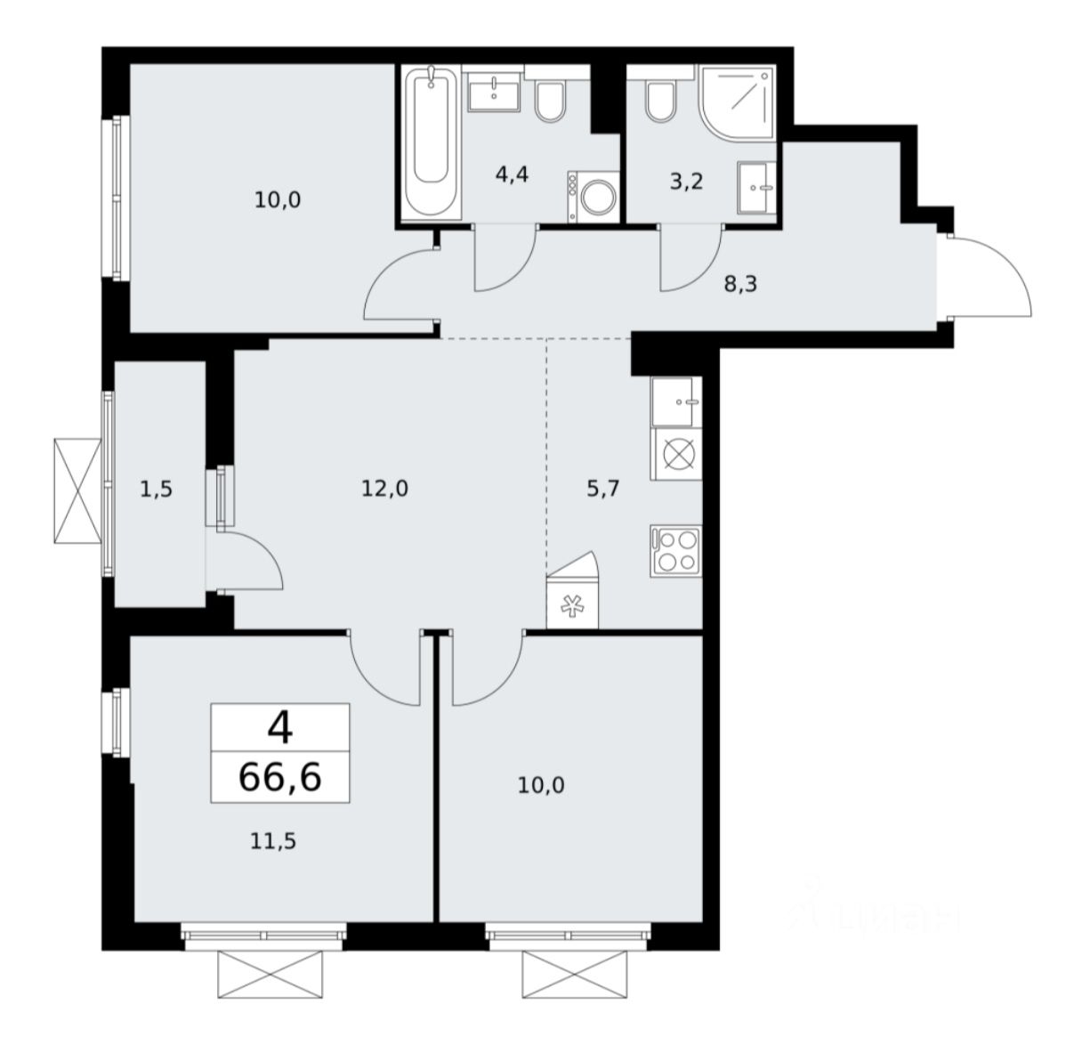Продаётся 4-х комнатная квартира в ЖК "Бунинские кварталы" (Корпус 7.4), площадь квартиры 66.6 кв.м. на 4-м этаже, срок сдачи: 2 кв. 2026 года.