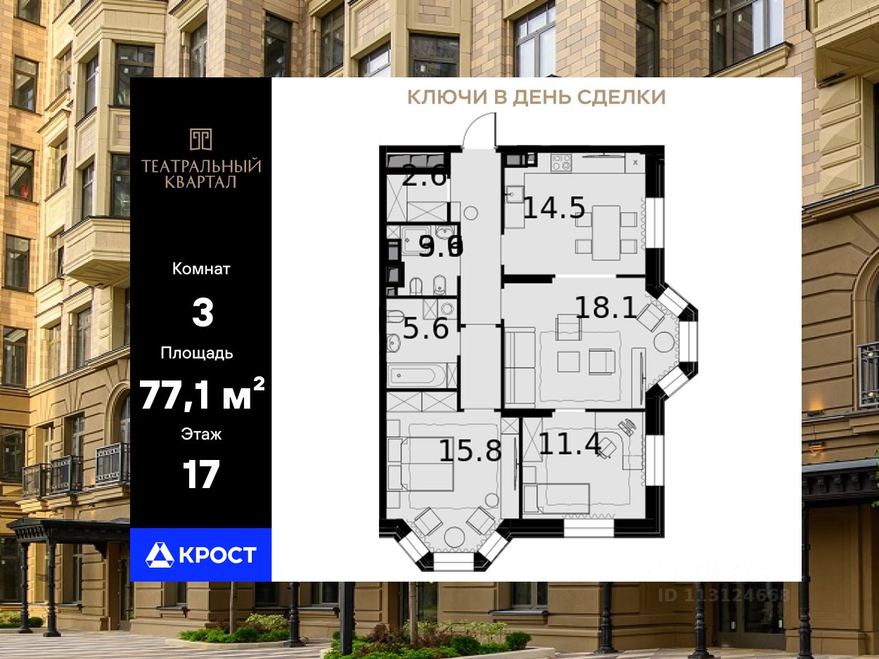 Площадь квартиры составляет 77,10 кв.м и находится на 17-ом этаже 24-этажного здания. Концепция комплекса вдохновлена театральной тематикой, предлагая сочетание неоклассической архитектуры с оригинальной отделкой холлов, изысканными фасадами и созданием культурно-просветительского пространства.