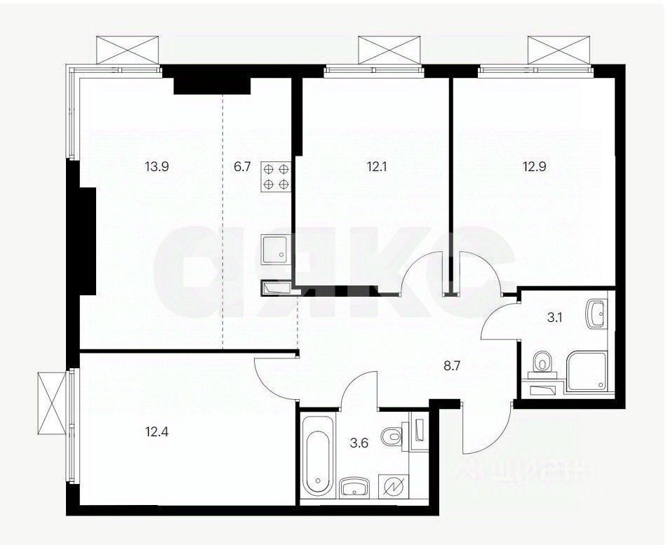 Общая площадь 75 м2. Просторная кухня-гостиная площадью 21 м2, три изолированные комнаты правильных форм. Два санузла (один с ванной, второй с душевой кабиной).