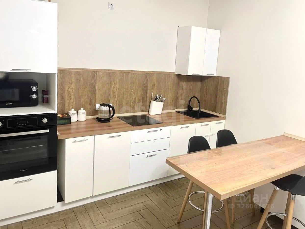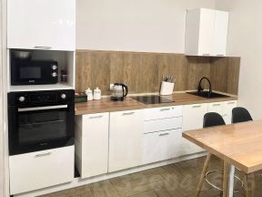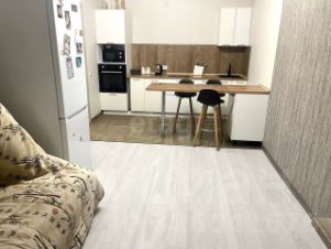 Кухня гостиная полностью укомплектована всей необходимой техникой и мебелью. Качественный кухонный гарнитур, электрическая варочная поверхность, духовой шкаф, микроволновая печь и холодильник. Стол в формате барной стойки с 3ми стульями и обычный обеденный стол, диван.