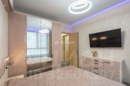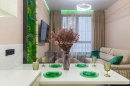 Просторная спальня в мягких пастельных оттенках. Вместительная система хранения с зеркальными фасадами, ТВ-зона и комод лаконичного дизайна. Кондиционирование Гостиная и общественное пространство: